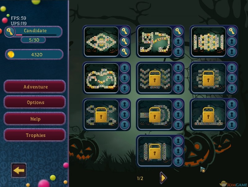 游戏界面的设置非常符合万圣节的气氛,会有一些物品,当你不能确定可以消除麻将,你可以选择使用这些东西,这将使你的通关更容易。游戏使用经典力学的消除,游戏中的玩家的任务是取消相同数量的麻将。每消灭一个麻将,你会得到相应的点。与此同时,将会有额外的任务在城门口,右边的屏幕会有一些不同的麻将点,成功地消除了麻将会得到奖金。