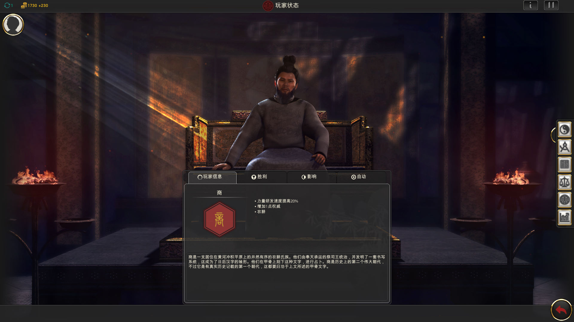 共有16个不同的派系,每个派系都有其独特的增益或减益效果,如楚国具有文化、贵族和海军的优势,商朝则有权威和农业优势等,为玩家提供了多样化的游戏体验。