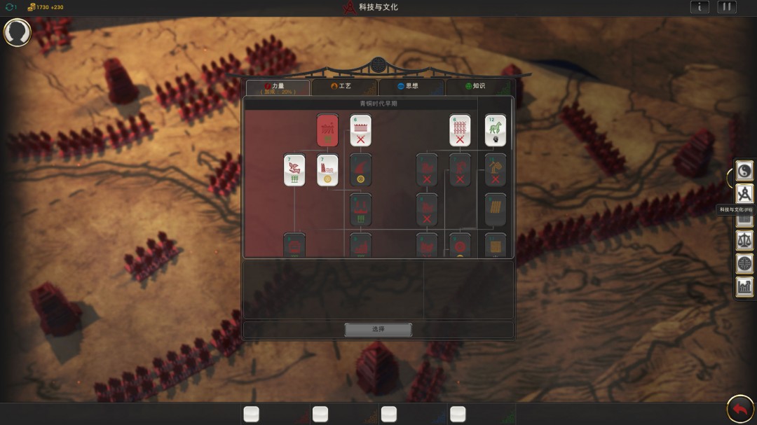 精心培养科技树,分为力量、技艺、思想和知识四大类,研发成果可带来科技、文化、哲学与宗教方面的进步,如解锁新的建筑、兵种或提供各方面的加成。同时,玩家还需关注文化和权威数值,提升胜利点数、殖民地满意度以及控制帝国的大小。