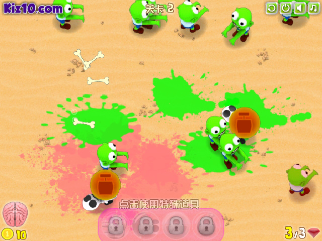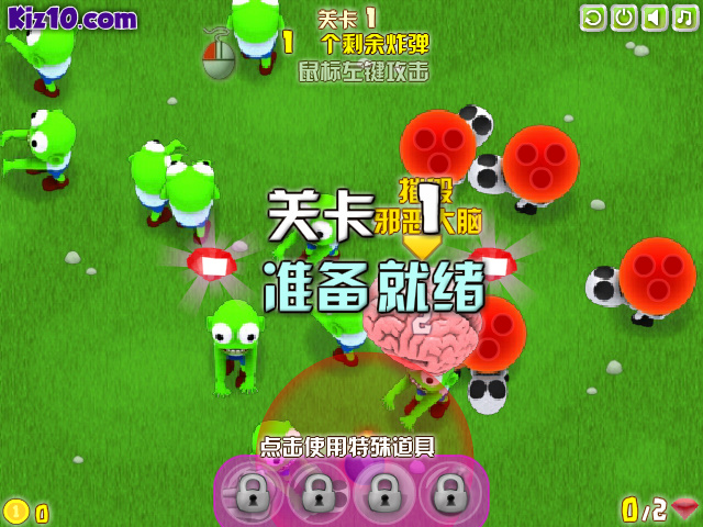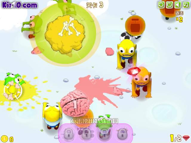 游戏中,你的使命是打破所有邪恶的大脑,点击僵尸附近的任何地方,触发爆炸和创建连锁反应,使用骷髅和特殊道具来获得更强大的反应,收集的金币可以用来购买升级。