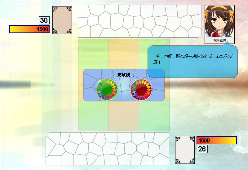 2.卡回合:最初的阶段,在这个阶段中回合玩家可以抽取自己卡组最上面的一张卡加入自己的手牌,如果卡组内已经没有可抽的卡的时候决斗失败。抽卡之后自动的移向下一个阶段。