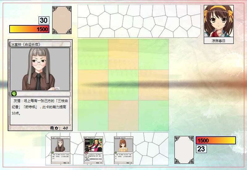 4.战回合:出卡回合结束后,进入萌战回合。场上的卡进行战斗的阶段,场上所有卡在同一时间比较其攻击方式和攻击等级,失败的卡被移除出战场。萌战回合结束后进入萌杀回合。