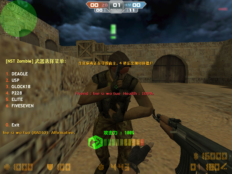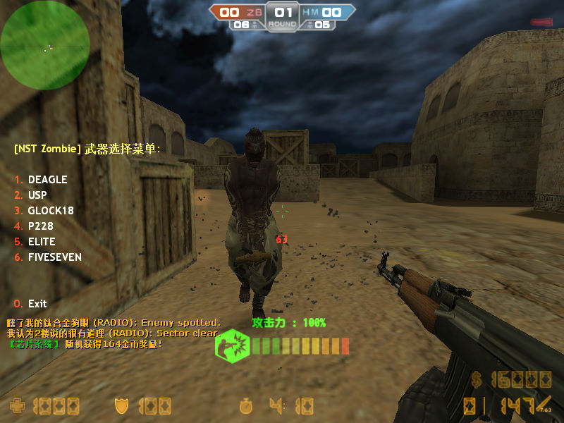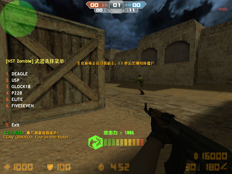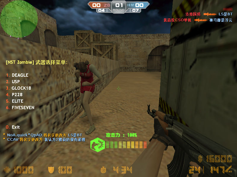 由少量的人类对抗大量僵尸群,每杀死一个僵尸可以获得100金币,击杀一定数量的僵尸后人物会升级,1011可以购买升级攻击力、生命值,血量每升一级增加20、攻击力增加10%(以上均可在nst_zombie_scenario.ini中修改)。
