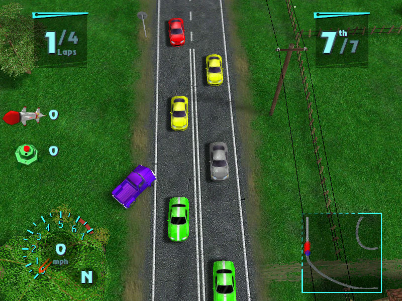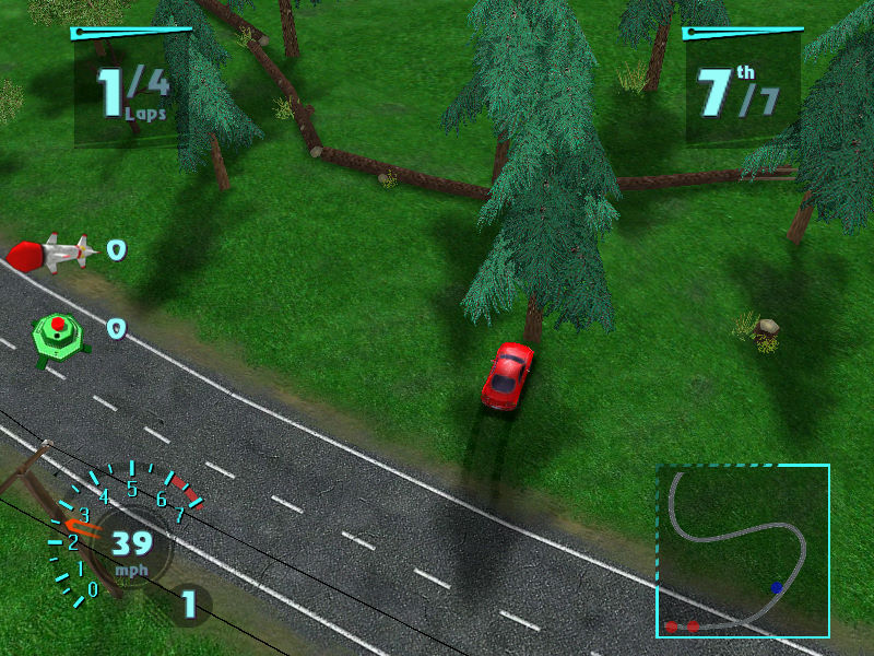 画面:游戏画面采用了3D渲染效果,车辆设计的精巧可爱。曲折的赛道,沙地或坑洼不平的路面,丰富的场景,独特的俯视角观看使画面表现独树一帜。