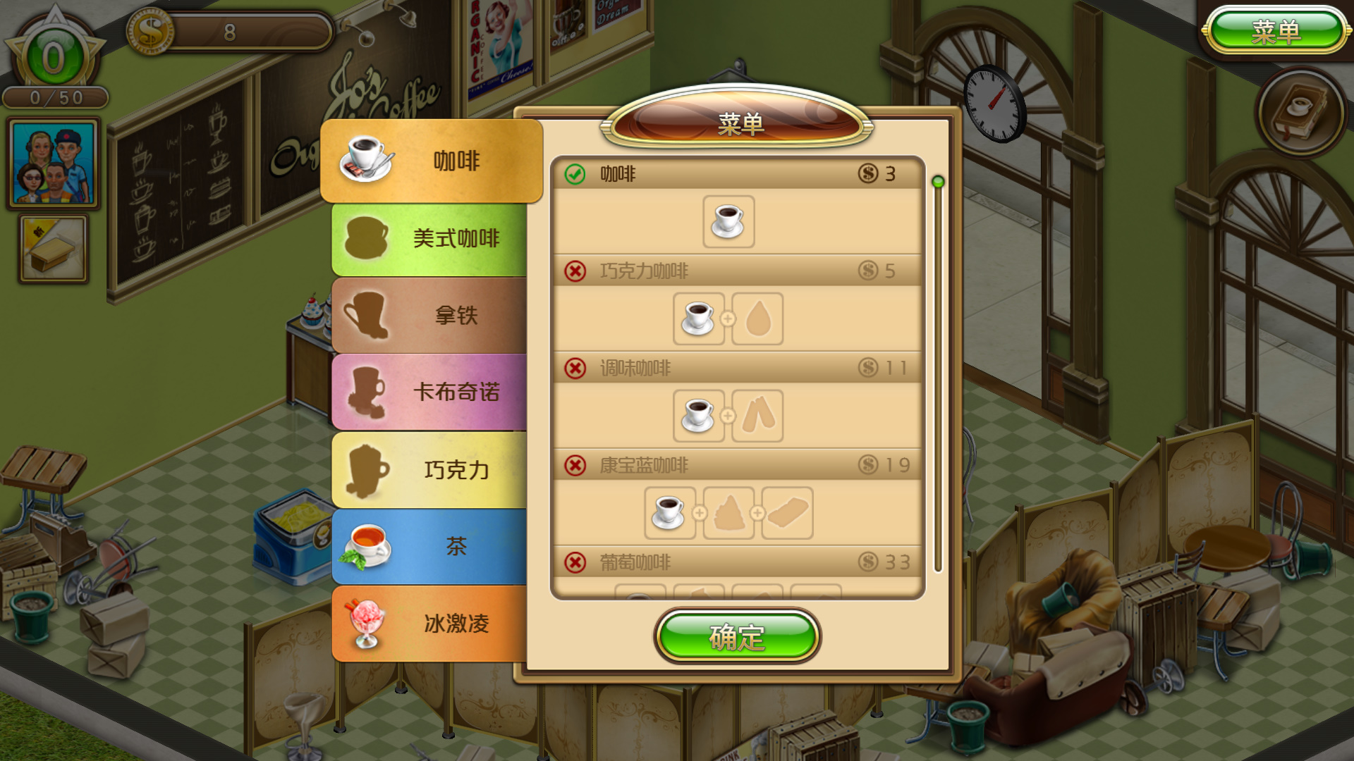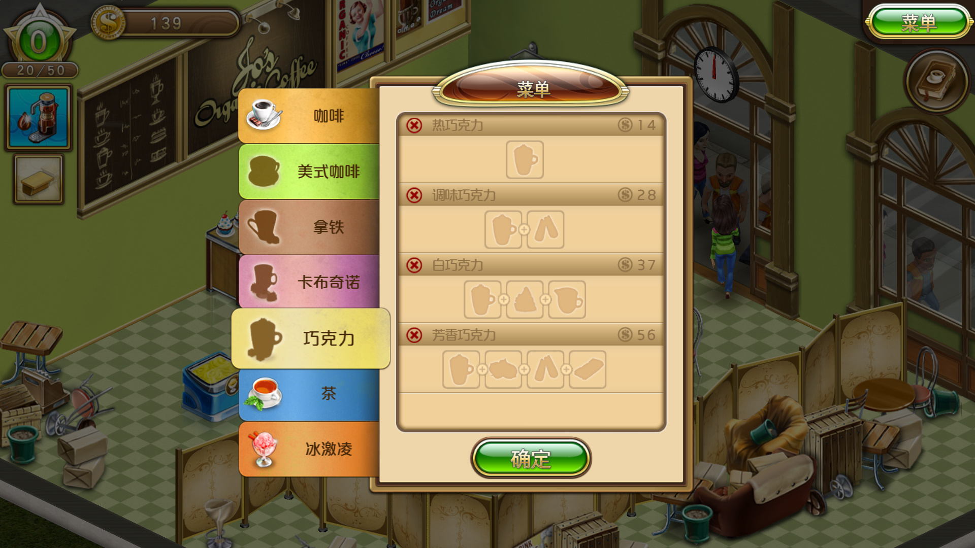 顾客进店坐下后,会立即显示一个笑脸,玩家点击后,会短暂的提示玩家顾客需要的东西,然后会立即消失,如果玩家没记住,可以再点一下顾客,还是能显示的。顾客的笑脸一开始是深绿色的,等待时间越久颜色越淡,代表顾客越不耐烦。