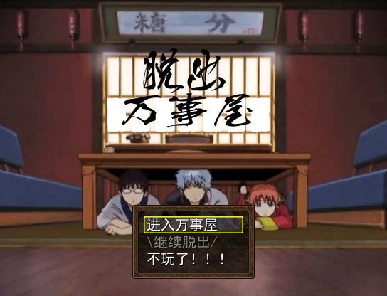 《脱出万事屋》是由玩家______莼黑制作的一款同人游戏,游戏讲述的是银时等三位主人公为逃脱交房租而发生的一系列有趣的事情,滑稽的表情,幽默的剧情,相信会给玩家带来无限欢乐。