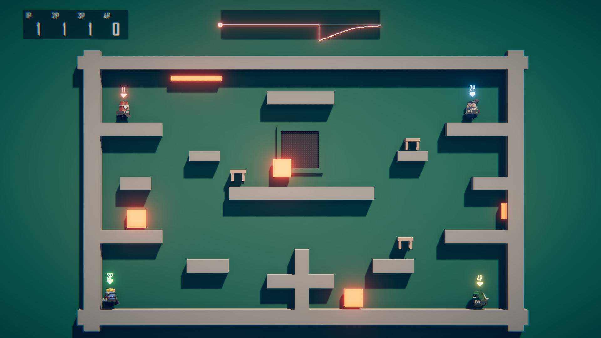 游戏支持2-4名玩家,你可以选择不同的角色加入战斗,在独特的关卡中不停的跳跃、躲避、射击,避开其他玩家的攻击,发射子弹将其消灭。游戏操作手感很棒,美术风格也很优秀。