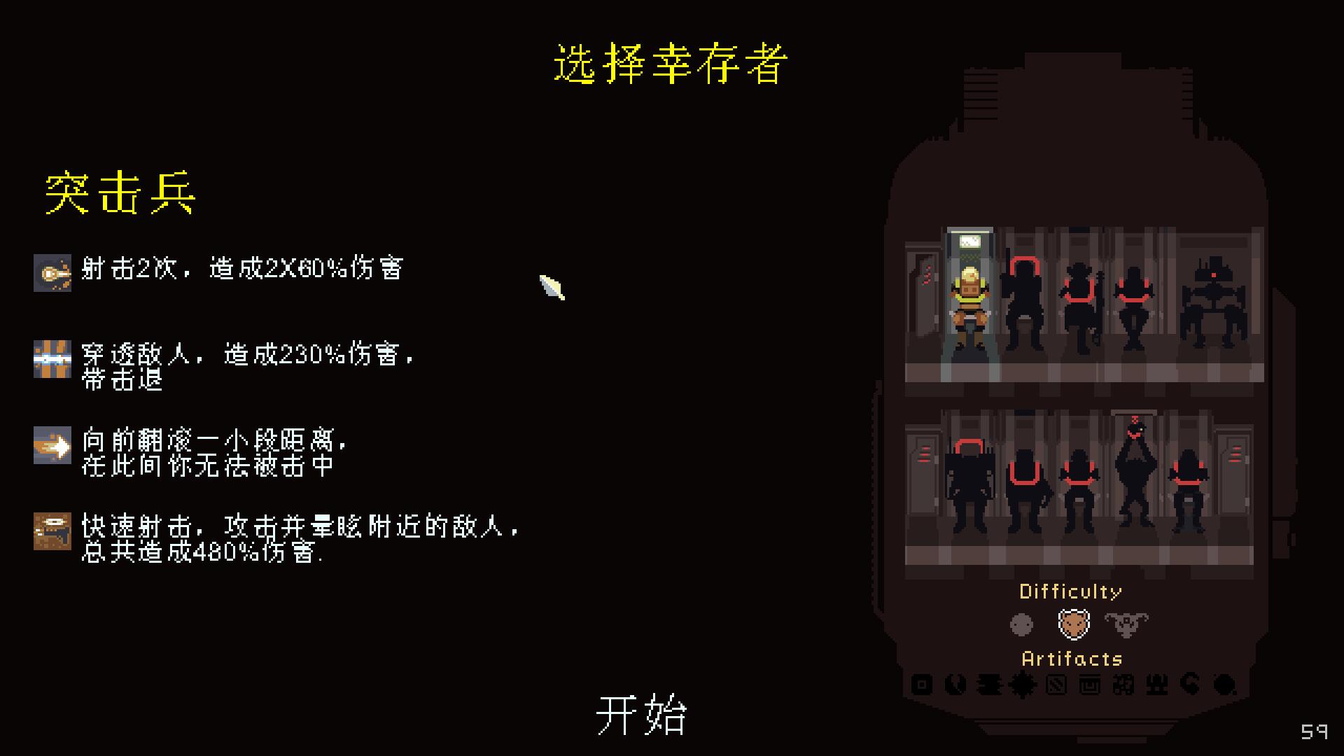 0人一款横版动作游戏,初始只有2个职业指挥官(Commando)和矿工(Miner)。这款游戏无论在道具上还是怪物种类方面,都有着极其丰富的种类。打怪或开宝箱所获得的道具,遇到的BOSS,都有着很高的随机性。玩这类游戏,不光操作要好,脸也很重要,否则出门遇到BOSS,直接Game Over。本作是一命模式,死了就得重头再来,早期死了无所谓,后期死了那真是一把辛酸泪,这也使其具有了一定的挑战性。