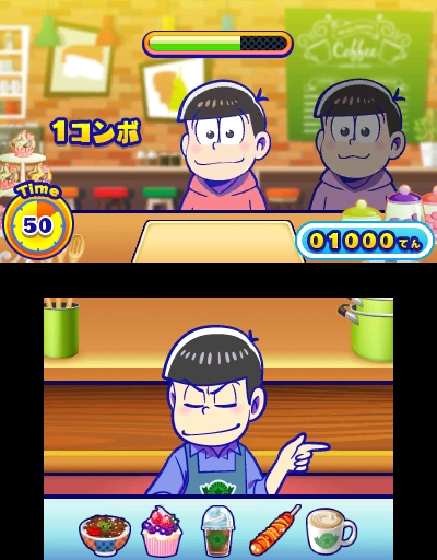 本作是根据人气动画《阿松》改编的游戏,游戏中收录各种祭典小游戏,阿松一家六兄弟都将登场,并根据他们的好感度解锁各种收集要素。