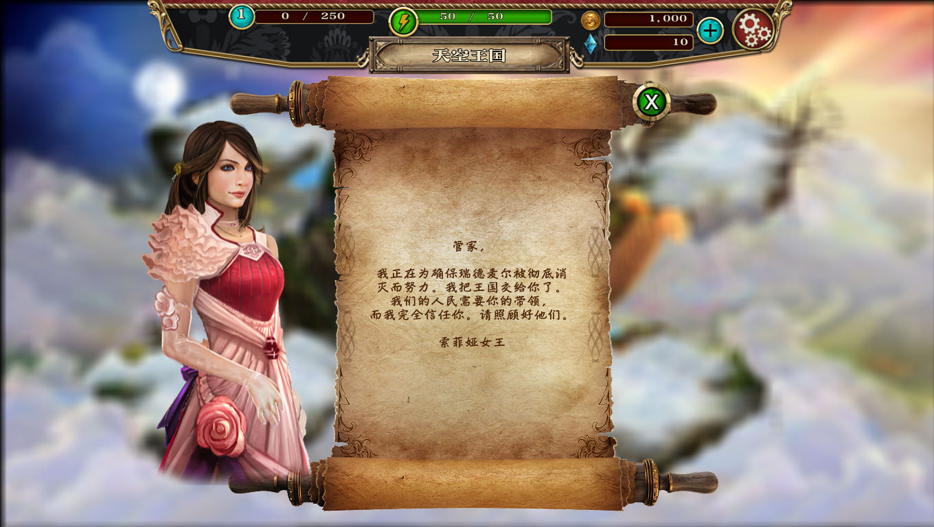 游戏讲诉了一个国家的女王去旅行了,她需要一个人来帮助他照料她的国家,而玩家将会被王后索菲亚选中,来替他照看这个国家。这是一个充满神奇的国度,在鸟语花香的美妙世界中,玩家将以救世主的身份对王后索菲亚的王国进行升级和改造,通过在这个有趣的迷你游戏和迷人的冒险解谜场景中,去恢复她王国昔日的繁荣景象。