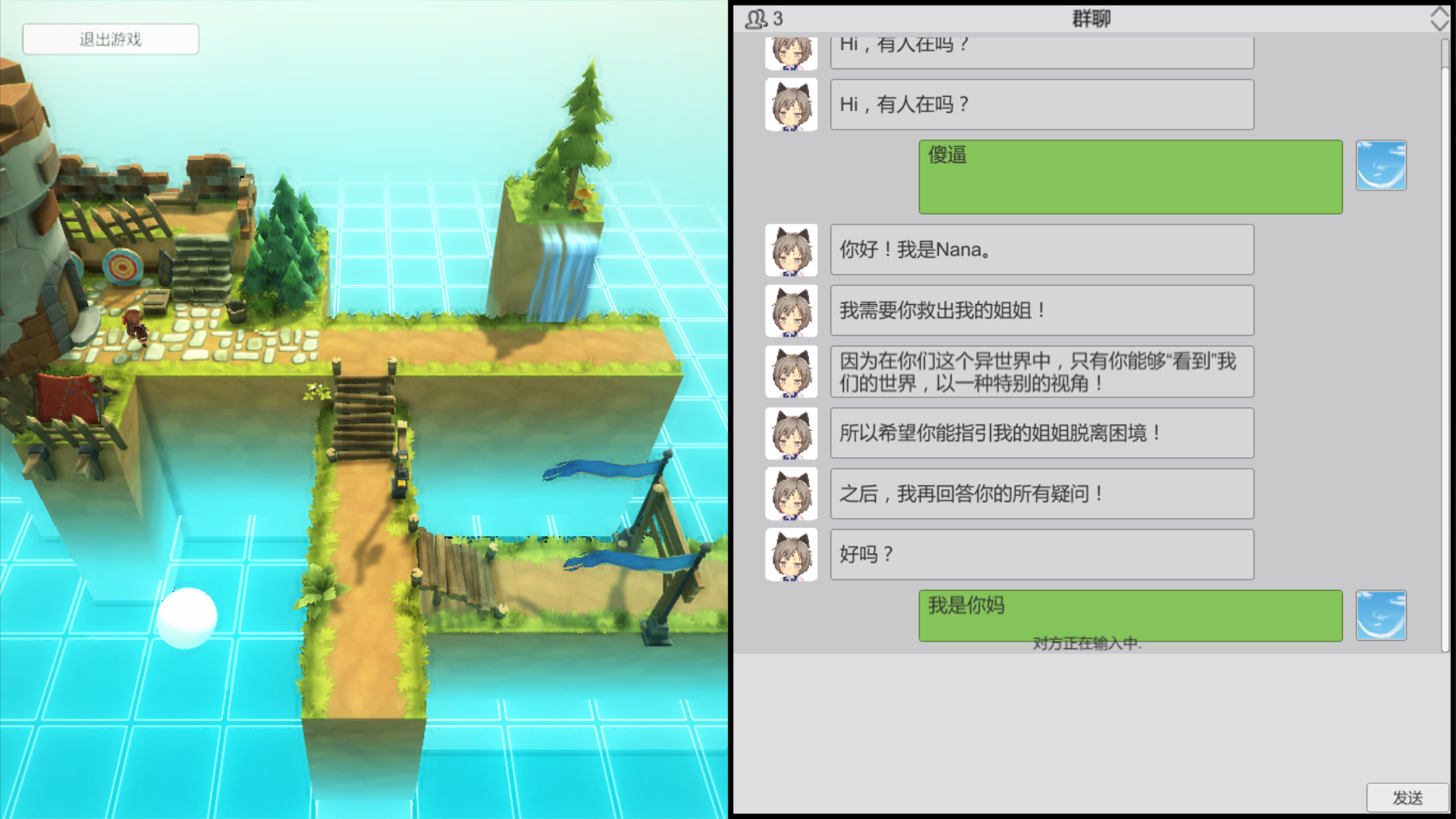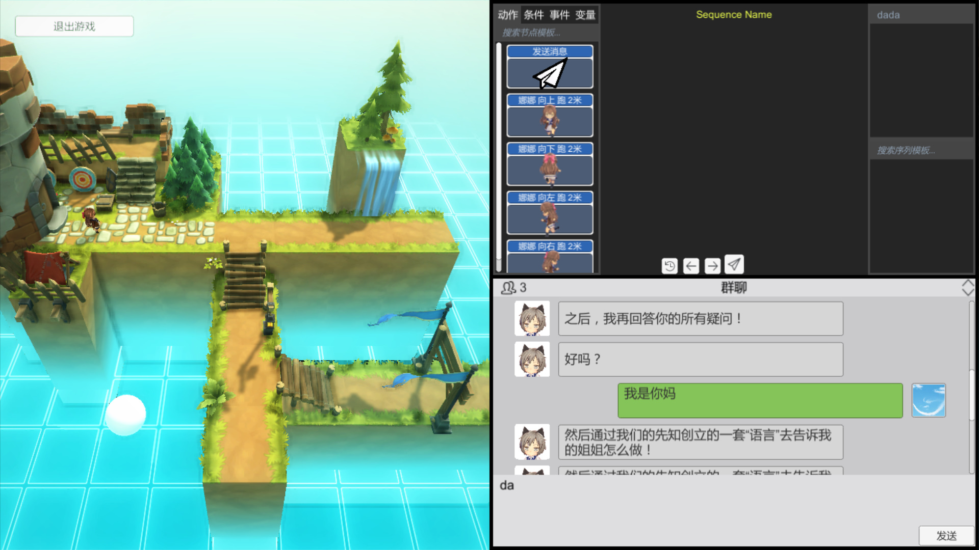 游戏中,女孩Nana的姐姐被困在城堡里,玩家在跟Nana的交谈中,了解救出姐姐的办法,通过使用向上跑2米、向左跑2米等动作,帮助姐姐顺利逃脱。