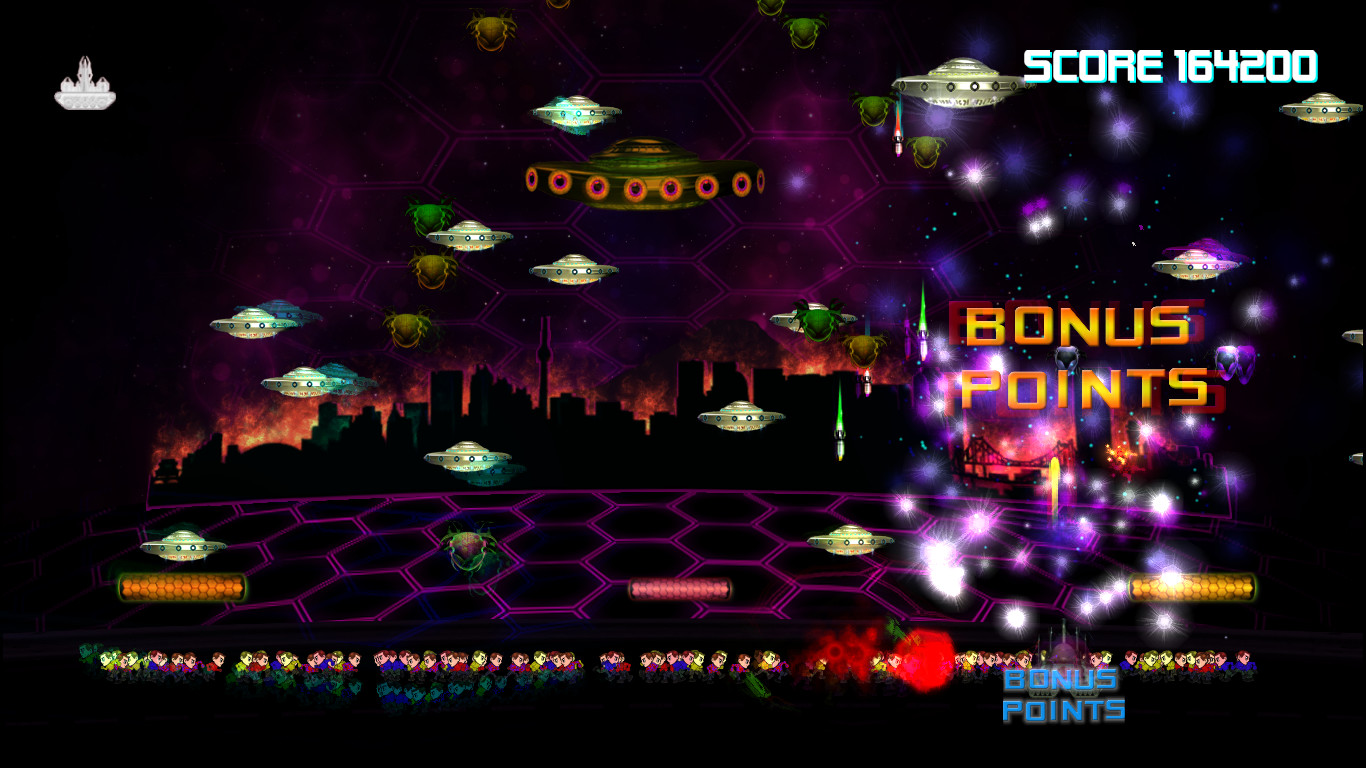 一个游戏模式,敌人的外星人不会射击..轻微的障碍,提前的阶段,你必须摧毁他们足够的讨厌的小外星飞碟......听起来容易吗?尝试挑战。