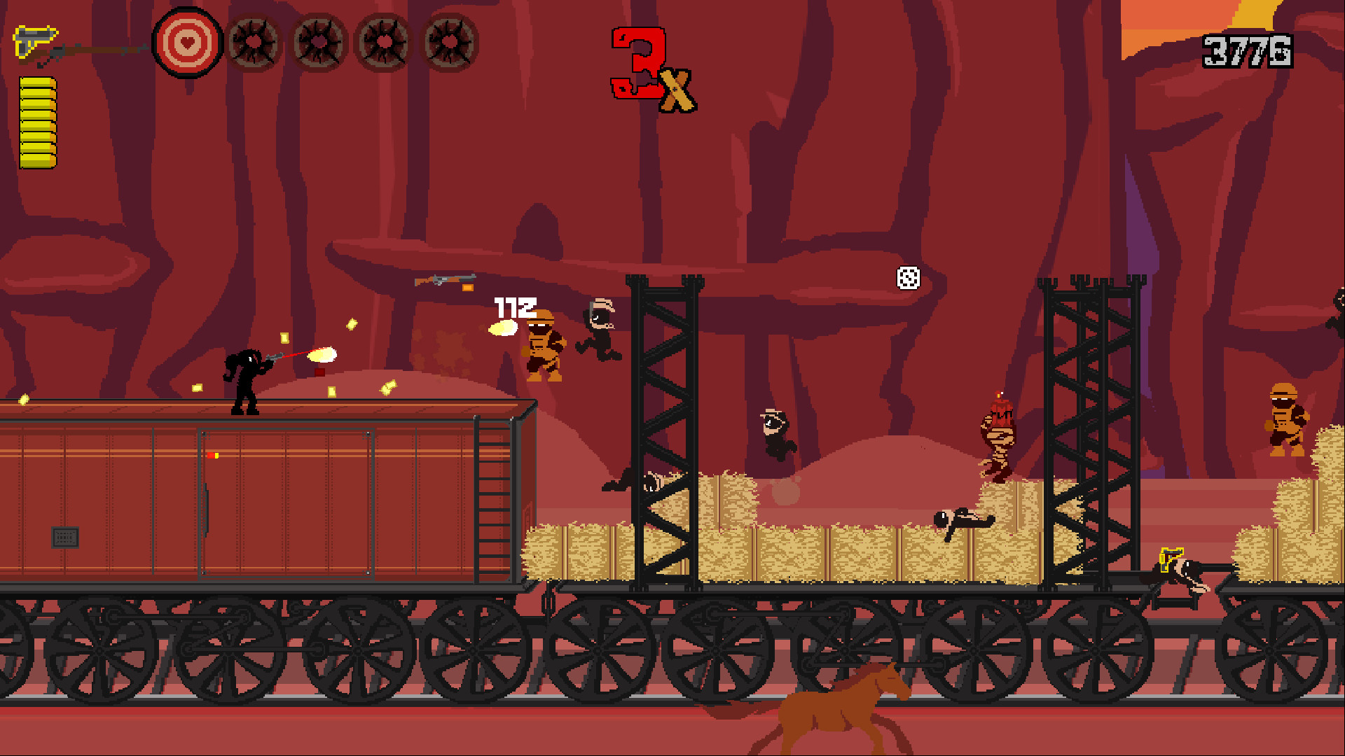 玩家将控制你的角色,使用射击武器,在不断前进的车箱中一边前进,一边打倒敌人、躲开敌人的攻击。《枪枪枪GUNGUNGUN》还可以捡到敌人掉落的武器和金币,用来升级更加强大的武器。