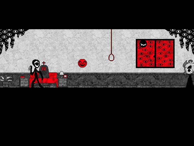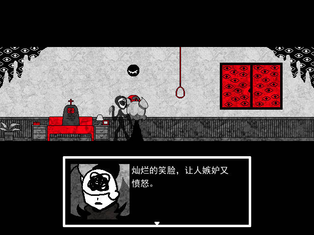 虽然只是一款非常简单的小游戏,但是其诡异的画风和带有负能量的游戏主题还是为其吸引了不少玩家的目光,体验过的玩家都有一种说不清道不明的感觉。首先我们来看画面,可以看出在本作中除红色之外其他所以的一切都是黑白的,这让整体的画面里的红色变得特别的显眼,恐怖的同时还带有诡异感,而且游戏中的人物角色的造型都是奇形怪状,让人感受到了其所要表达的扭曲还有痛苦,这可能也映射出了作者的一些心理变化。总的来说是一部很有意思的作品,感兴趣的朋友可以下载下来体验一下